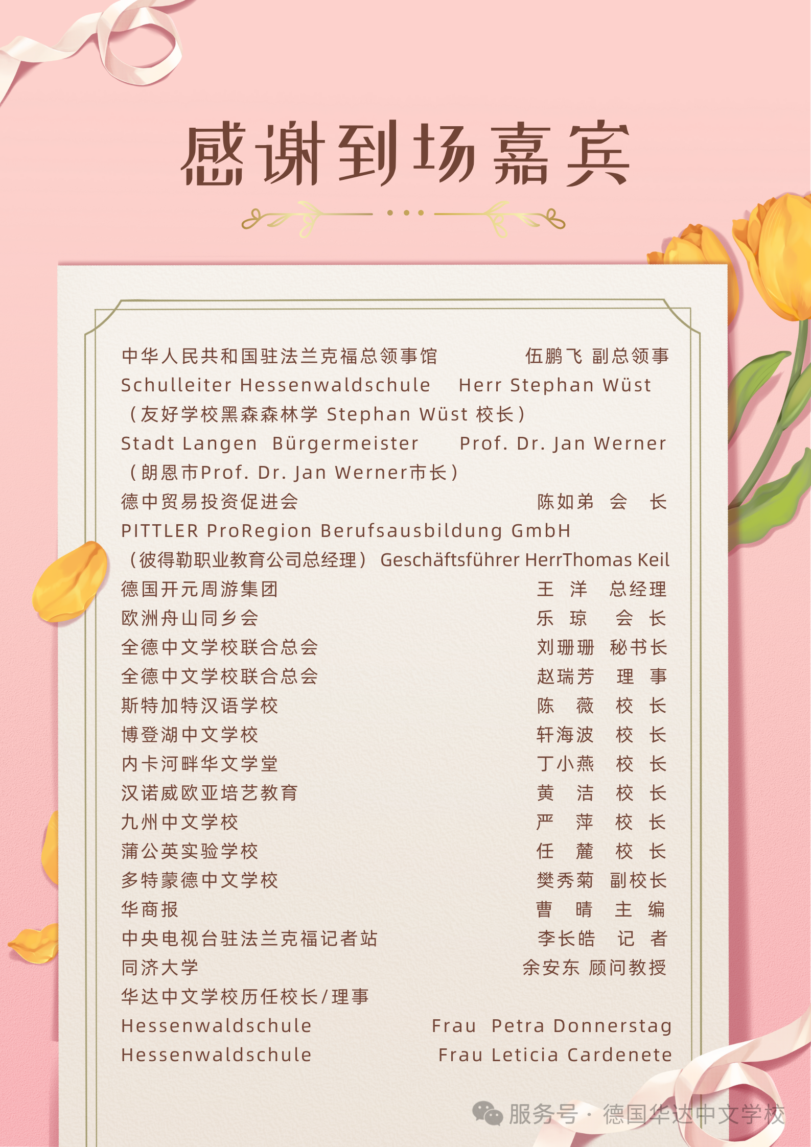“三十年前筚路蓝缕,三十年来风雨兼程。华达中文学校始终秉持弘扬中华文化的使命,在海外华文教育领域辛勤耕耘。这些年来,我们一起见证了华达从一个只有十几名学生的中文班,一步步成长为全德国最大、最重要的中文学校之一,更见证了许许多多“华二代”和出身中德家庭的孩子们在华达掌握了受益终身的语言技能,加深了对中华文化的喜爱与热情。可以说,华达中文学校不仅为华侨华人子女搭建了传承中华优秀传统文化的桥梁,更增进了德国民众对中国的了解,为中德人民民心相通、文明交流互鉴作出了重要贡献。”