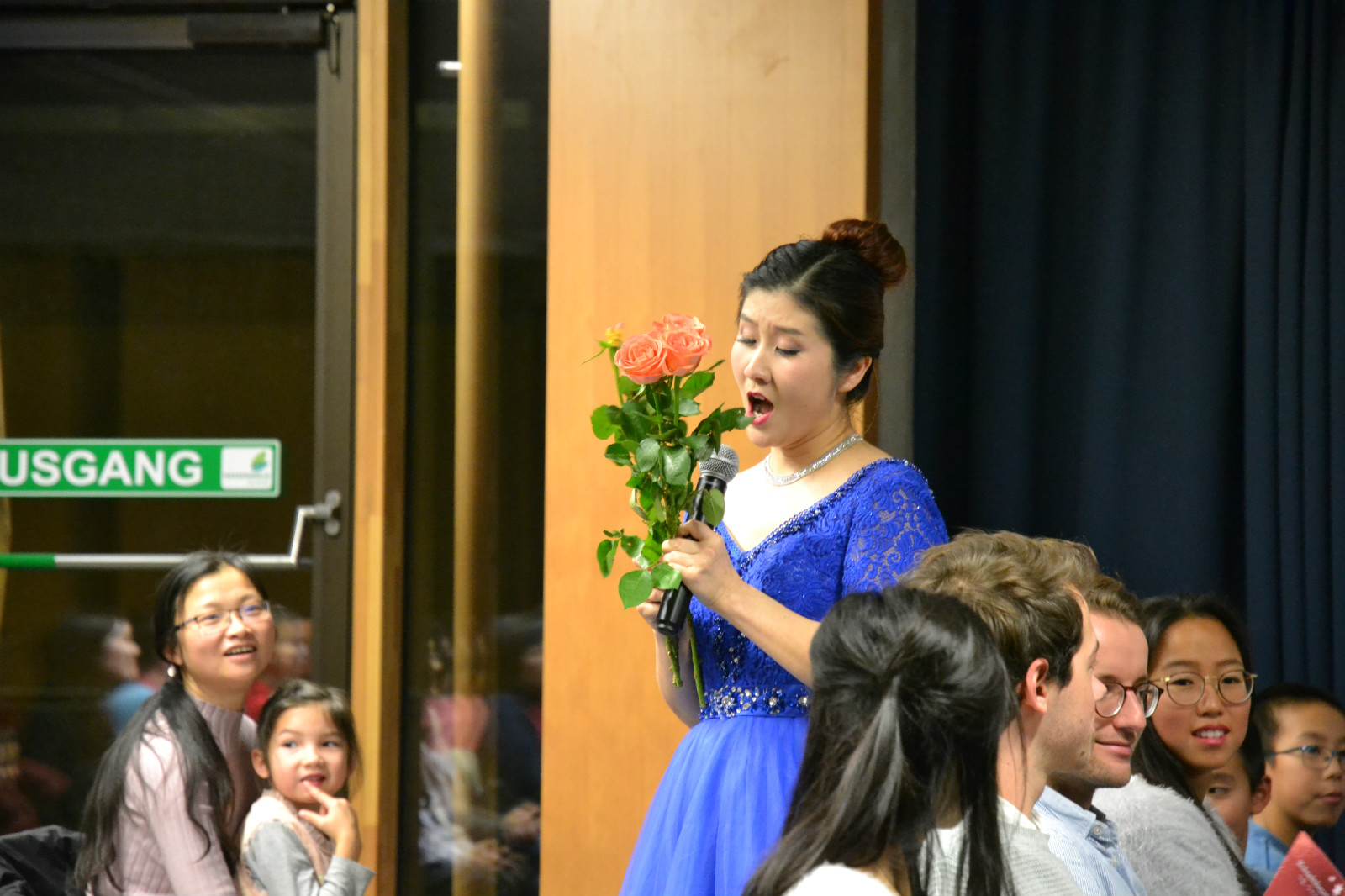 接下来由华达的三位民乐老师虞娟娟(古筝)、张佳婧(二胡)和郁鑫睿(笛子)为观众带来一首明快而又生动的名曲《赛马》,民族乐器的悠扬琴声勾起了大家的思乡情结,一曲根本不过瘾,在观众的强烈要求下他们又加演了一首德国耳熟能详的圣诞曲目才被放过;借着民乐的热度,下午曾给大家做了精彩报告的周爱莲老师给观众带来昆曲“牡丹亭”游园一折中的皂罗袍一段,她的一唱一动,一笑一品,都尽显国粹之魅力,把现场不少孩子的注意力也吸引住了,整个大厅安安静静,鸦雀无声。